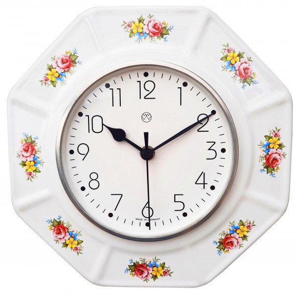 Funk-Küchenuhr, weißes Keramik-Gehäuse, Dekoration Handarbeit, Mineralglas, Aluglasring, Funkwerk, Dekor / Blüten, schwarze Herzzeiger.