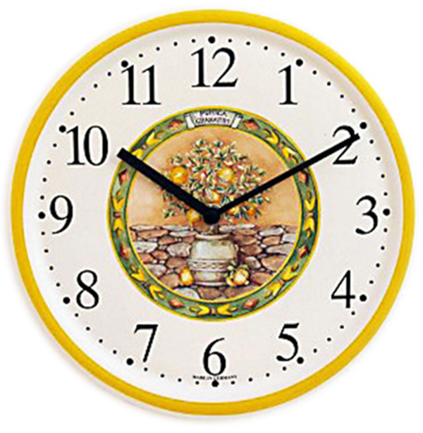 Keramik-Küchenuhr, weißes rundes Keramik-Gehäuse, Dekoration und Malerei Handarbeit, Dekor / Orangenbaum, Quarzwerk, schwarze Zeiger.