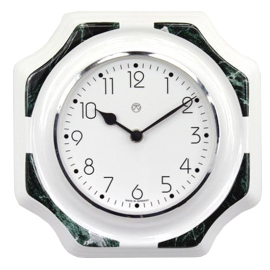 Quarz-Küchenuhr, weißes Keramik-Gehäuse, Dekoration Handarbeit, Mineralglas, Aluglasring, grüner Dekorrand, Quarzwerk, schwarze Herzzeiger.