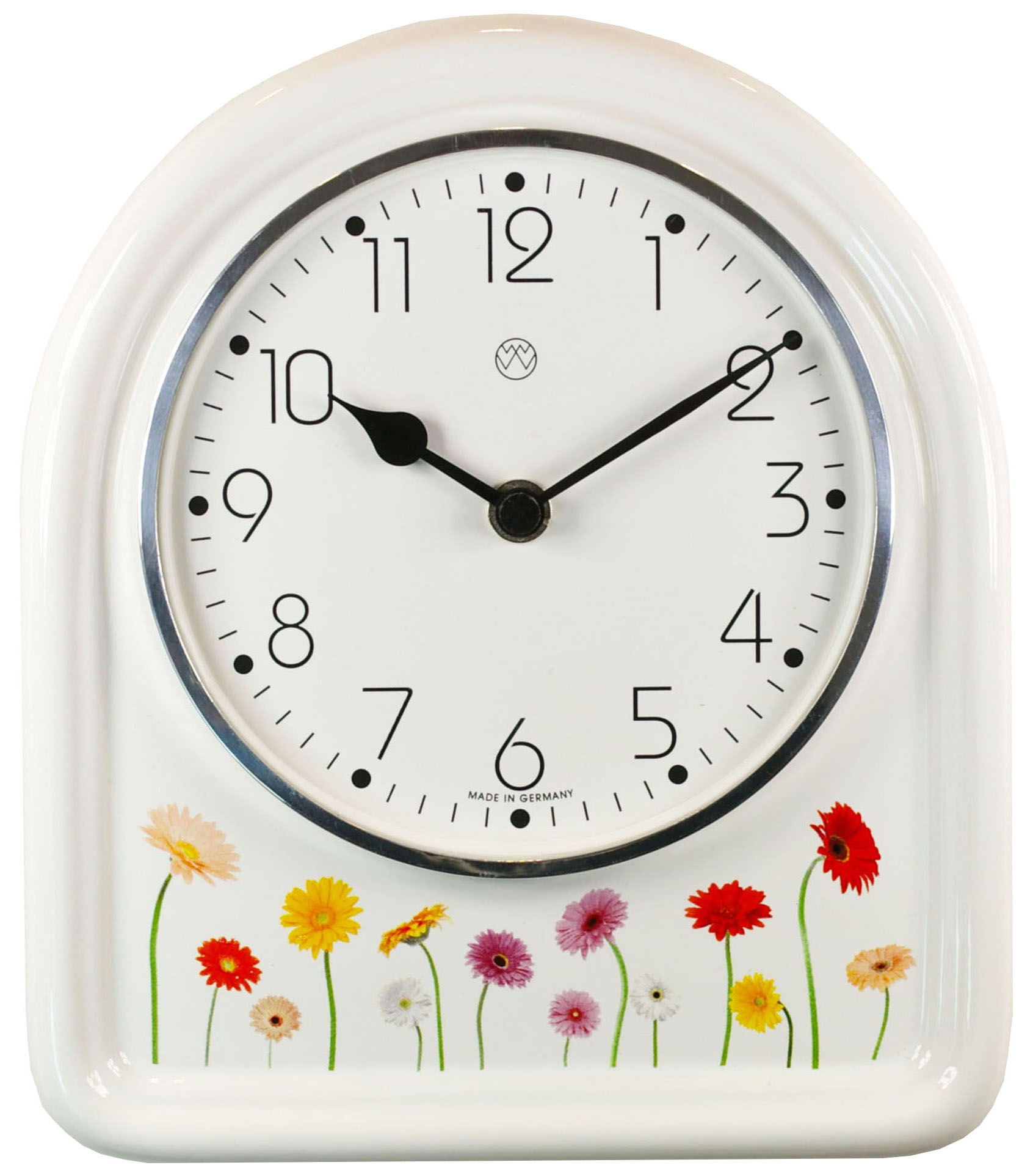 Quarz-Küchenuhr, weißes Keramik-Gehäuse, Dekoration Handarbeit, Aluglasring, Mineralglas, Dekor / Gerbera, Quarzwerk, schwarze Herzzeiger.