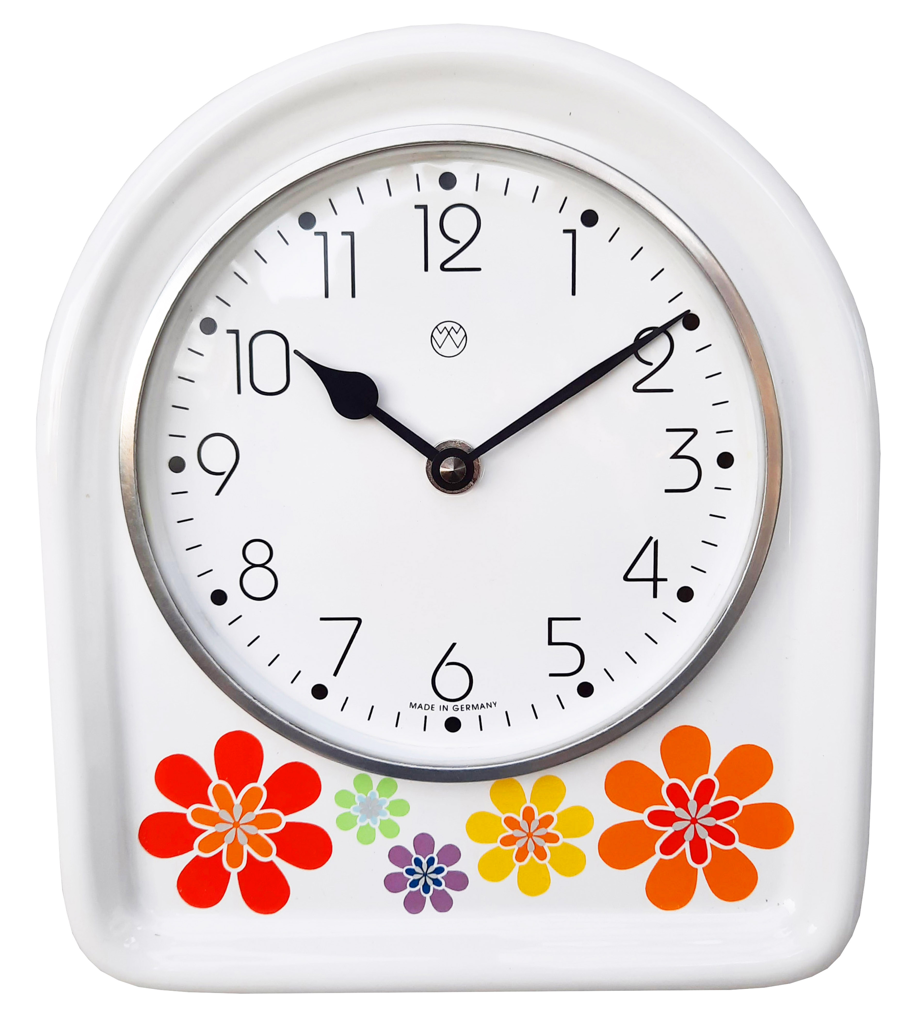 Quarz-Küchenuhr, weißes Keramik-Gehäuse, Dekoration Handarbeit, Dekor / retro-Look, Mineralglas, Aluglasrand, Quarzwerk, schwarze Herzzeiger.