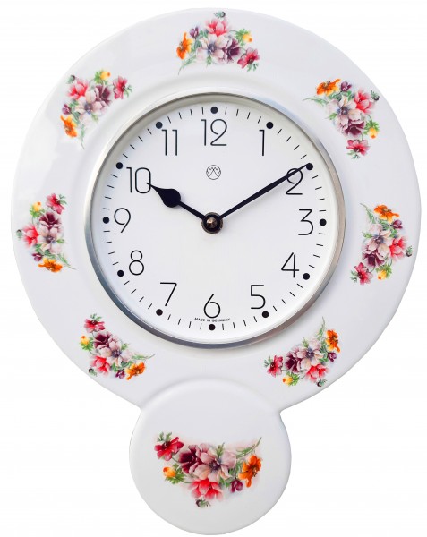 Quarz-Küchenuhr, weißes aufwendiges Keramik-Gehäuse, Dekoration Handarbeit, Dekor / Blume, Mineralglas, Aluglasrand, Quarzwerk, schwarze Herzzeiger.